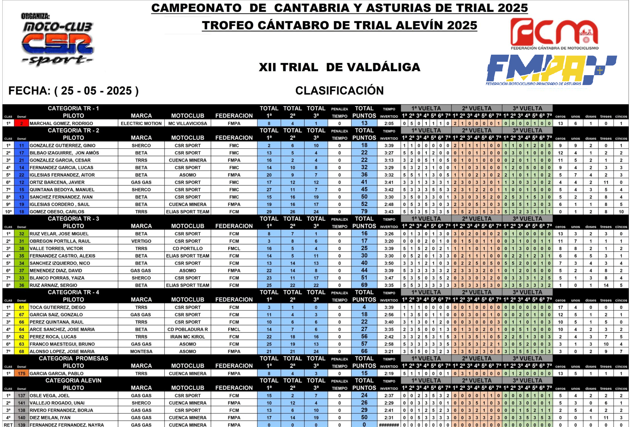 En cuanto a nuestros pilotos tuvimos en Alevín Unai Vallejo que fue segundo, y a Iyan Diez y Nayra Fernández; en TR5 victoria de Pablo García; en TR4 Jose María Alonso; en TR3 estuvo David Menéndez; en TR2 tercer cajón del podium para Cesar González, donde también estuvieron Aitor Iglesias y Saúl Iglesias; y en TR1, Rodrigo Marchal, sumando una victoria más a su palmarés.